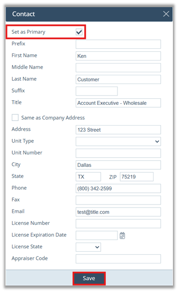 - If applicable, select Set as Primary if this contact will be the primary contact.