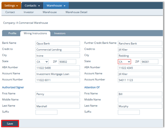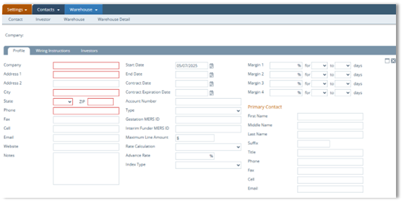 Adding Warehouse Lenders (Profile, Wiring Instructions, Warehouse Investors)