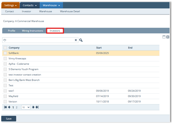 - To associate an investor with the selected warehouse, click an investor's name.