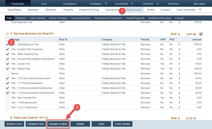 1. Go to Production > Closing Costs > Fees and select the checkbox(es) of the title fee(s).