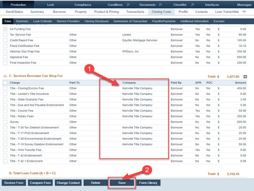 To change the company name for one or multiple title fees in (section C. Services Borrower Can Shop For) follow the steps below.