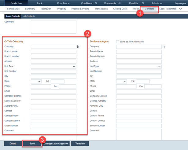 6. If a title company is not found through the above steps, you can add it to the loan via Production > Contacts > Loan Contacts.