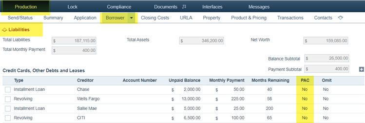 1. Go to Production > Borrower > Liabilities