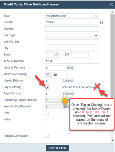 3. Select the Pay at Closing checkbox, then click Save & Close, to close the lightbox.