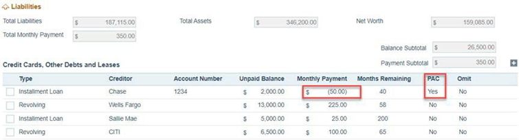 Note: The PAC column now has the debt indicated.