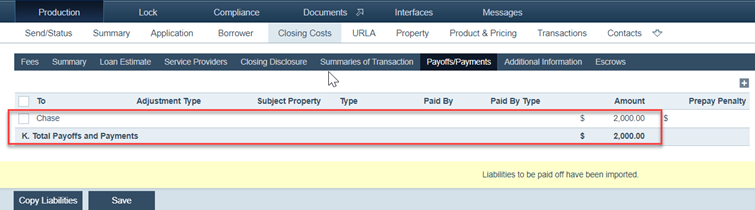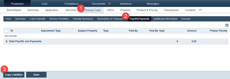 4. Next, go to Production > Closing Costs > Payoffs/Payments tab.
