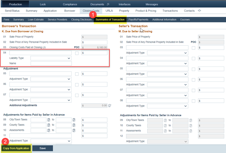 6. Next, go to Production > Closing Costs > Summaries of Transaction tab.