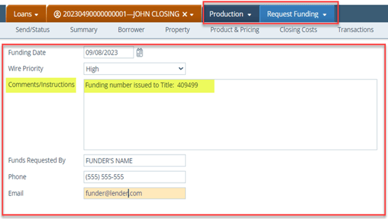 Note: The Request Funding screen can be used to issue a funding number to the settlement agent. You can enter the funding number in the Comments/Instructions field. The funding number can be tracked here and be reported in the funding report.