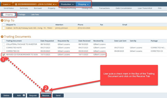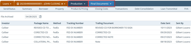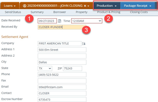2. After the original closing package is returned to the lender, the funder can go to the Production > Package Receipt screen to confirm receipt of the closing package.