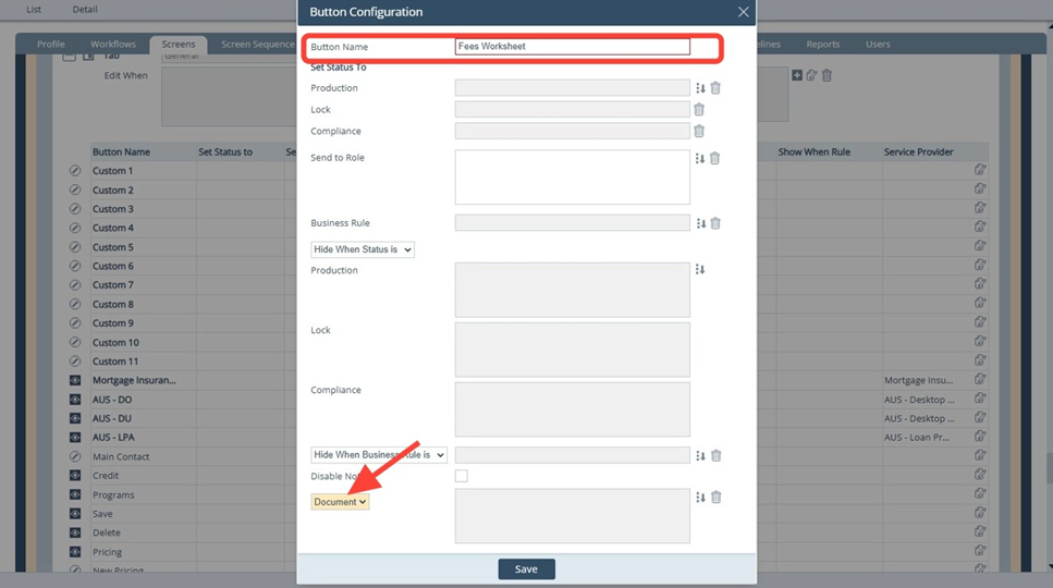 For example, the system admin can configure a button specifically to view the Fees Worksheet for the Closing Costs > Fees tab or the Quote screen, or configure a button specifically to view the Wire Disbursement form for the Closing Information > Wire tab.
