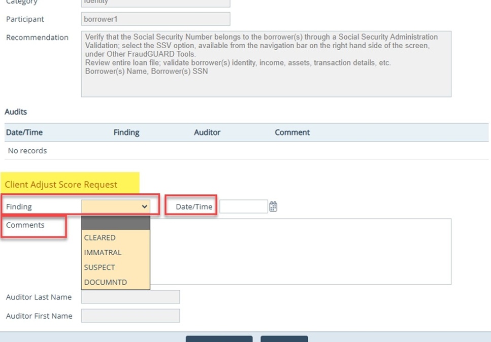 8. User may add findings and comments for a "Client Adjust Score" report