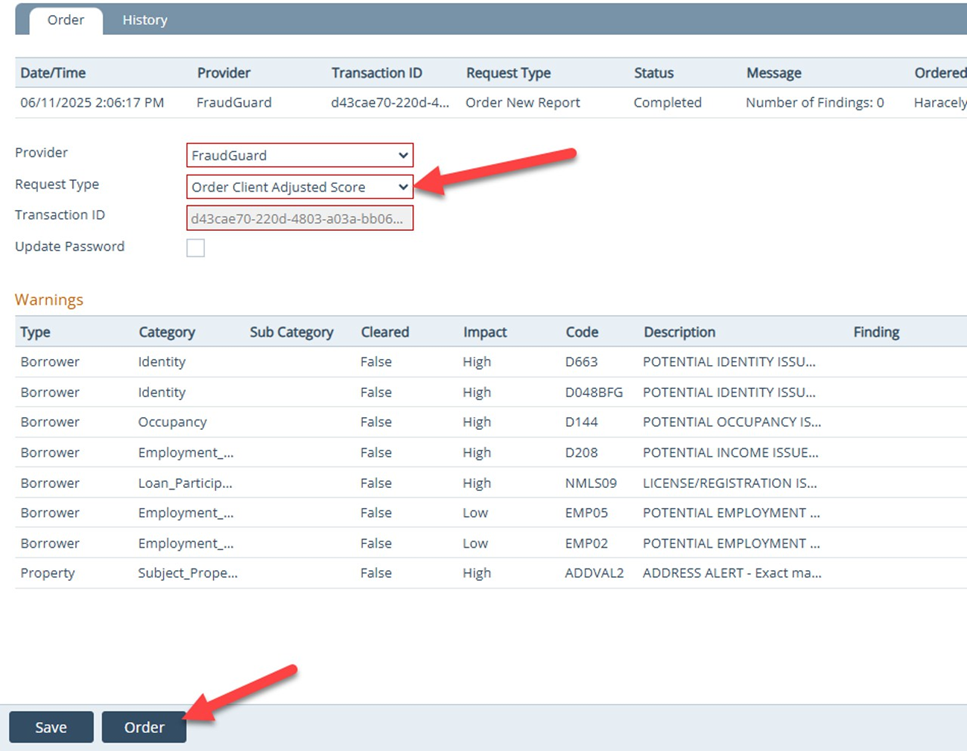 Reminder: If using older Fraudguard version, PDF document will not automatically upload. You must select " Order PDF report" from dropdown.