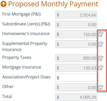 - Review Proposed Monthly Payment, including editing insurance/taxes and adding flood