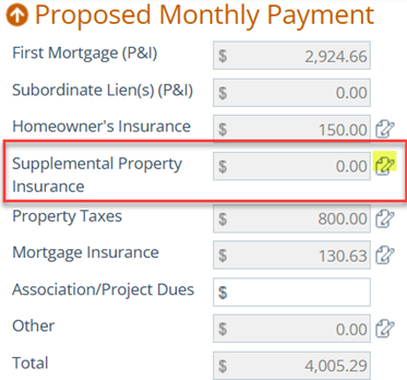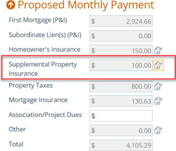 Flood insurance is added via Supplemental Property Insurance and then rolls into Proposed Monthly Payment.