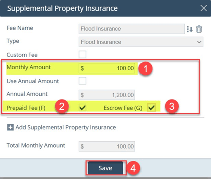 - Flood Insurance added correctly (monthly amount + Prepaid F if needed + Escrow G + Save)