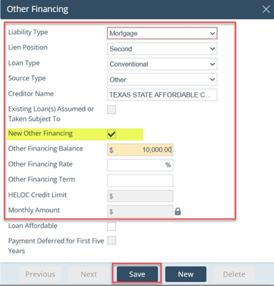 - Other Financing entered; DPA credit treatment set correctly (New Other Financing vs Existing Loan assumed)