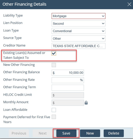 - If you do NOT want the other financing to be a credit at closing, select the Existing Loan(s) Assumed or Taken Subject To checkbox.