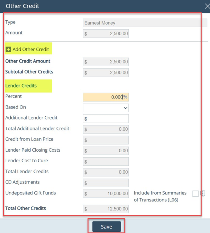 - Line-item Other Credits is a calculated field that pulls from Borrower > Assets > Other Credits including Earnest Money and Gift Funds.