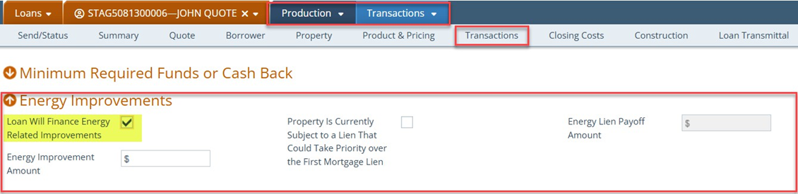 - To enable the Energy Improvement Amount field, select the Loan Will Finance Energy Related Improvements
