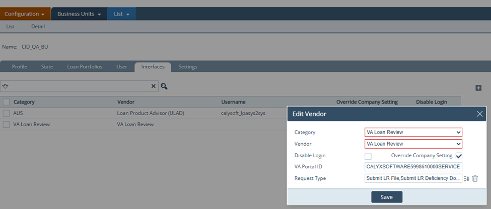 System Administrator can configure VA Portal ID and Request Type on the interface configuration screen