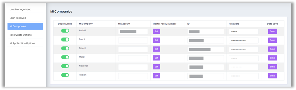Controls which Mortgage Insurance companies are available to users and stores credential requirements for each vendor.