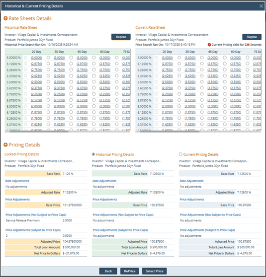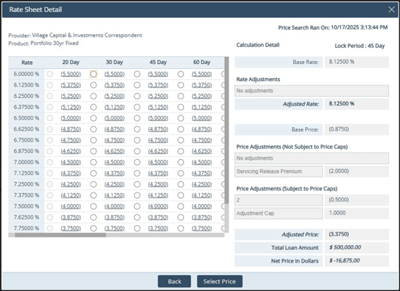 5. Select the most suitable rate and lock period and click the Select Price button,