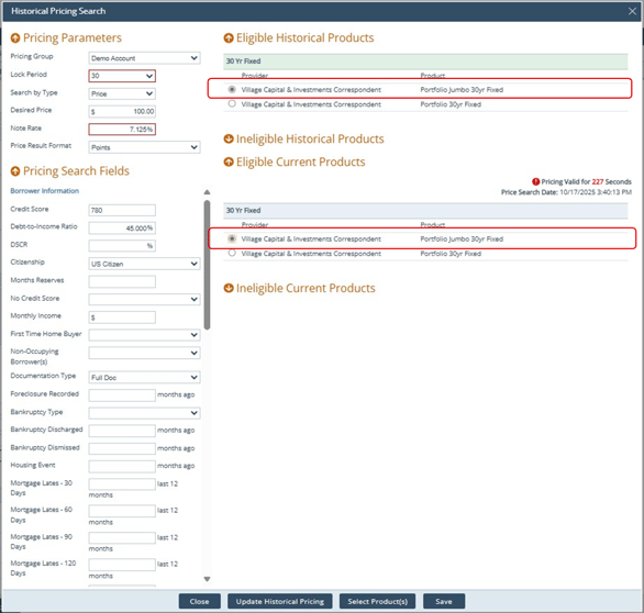 9. Click the Select Product(s) button, which open the Historical & Current Pricing Details lightbox.
