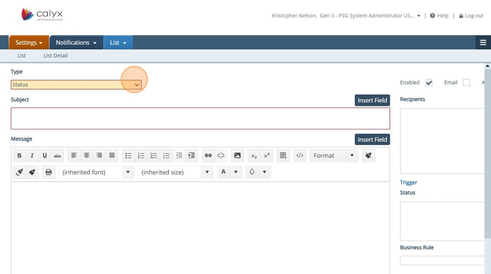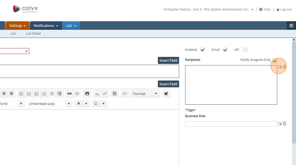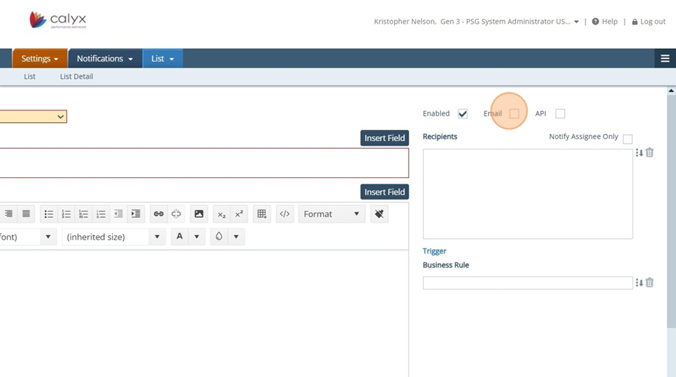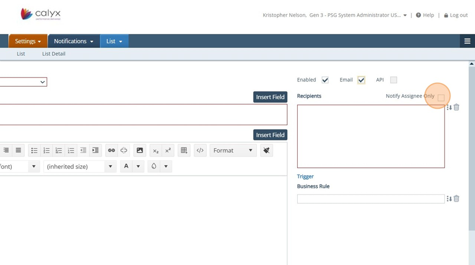 13. Settings - Notifications: Click on the Insert Field button to view the list of fields available for Notifications