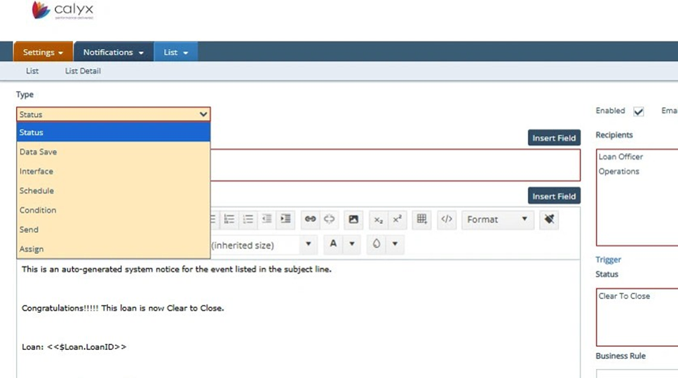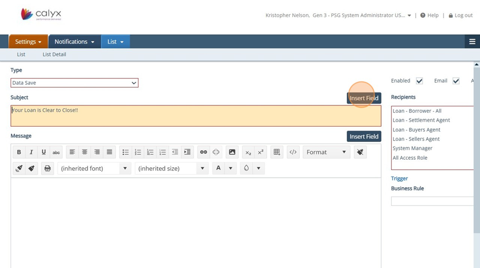 12. Settings - Notifications: Subject - Type your custom Subject message and or select Insert Field to insert different fields such as: Borrower Name or Property Address.
