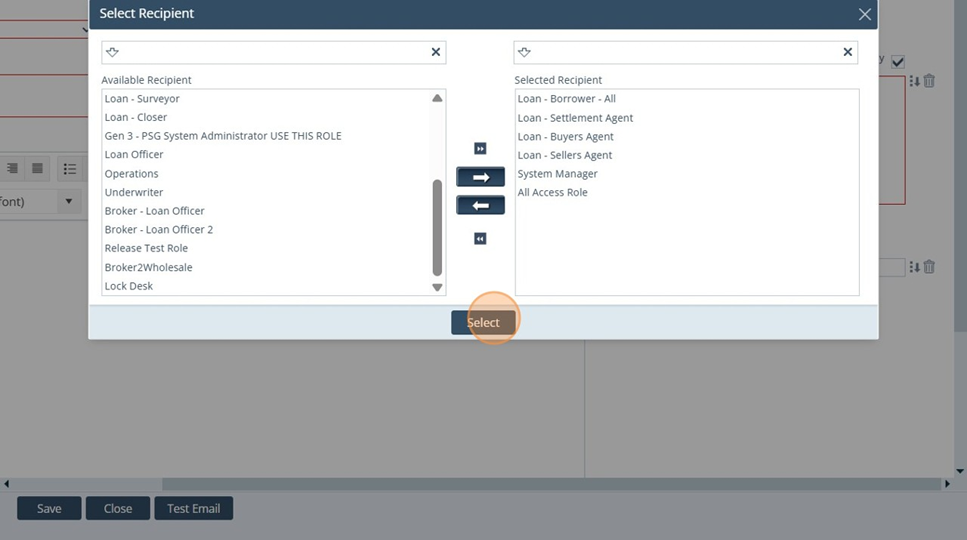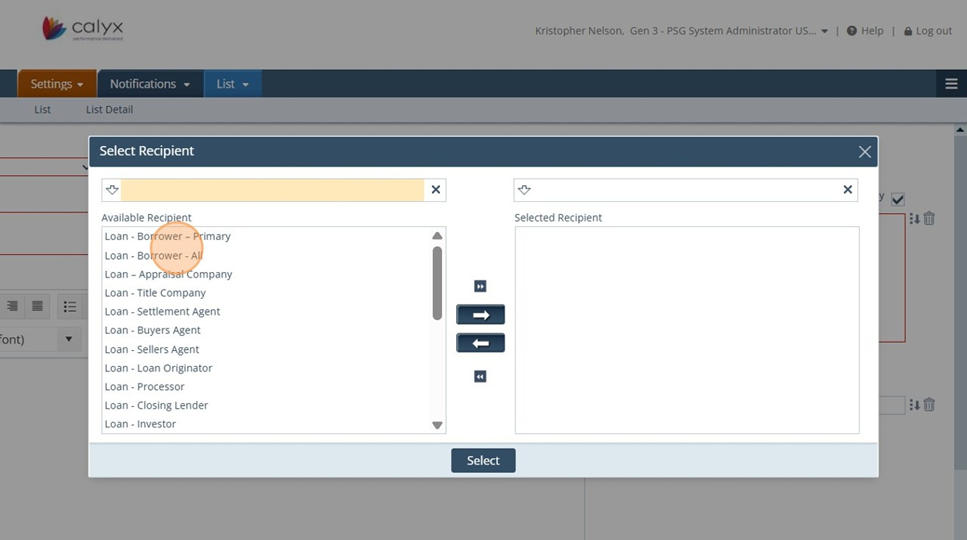 11. Settings - Notifications: Click select to add the Recipients to the Notification