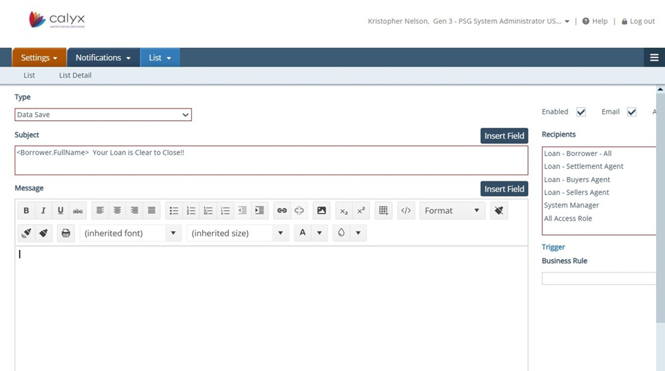 16. Settings - Notifications: The exported field, "Borrowers Full Name" was added to the Subject line. When this notification is sent it will always attached the Borrowers Full Name. Fields can be added to both the Subject and Message sections