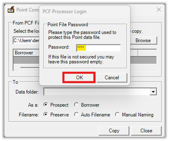 4. After the password window closes, confirm the “Select the location of the Point compressed file you wish to copy” field is now populated. You should now see the borrower's name and file name.