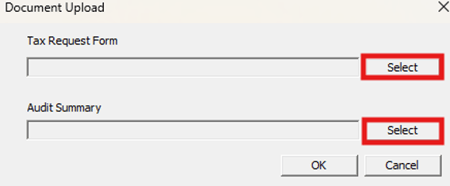 3. Click Select next to Tax Request Form or Audit Summary (whichever document you want to upload).