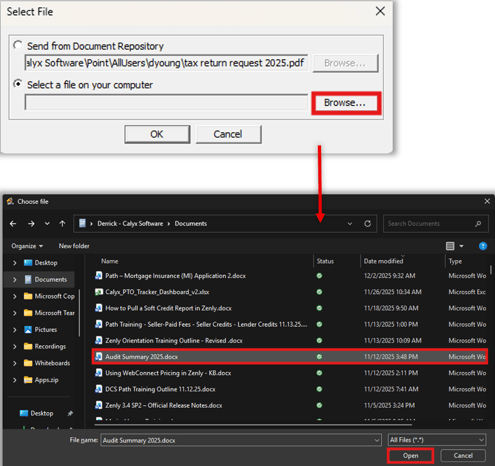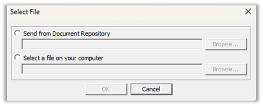 5. If Send from Document Repository is selected, click Browse to highlight a file stored in the document repository and click Select when complete.