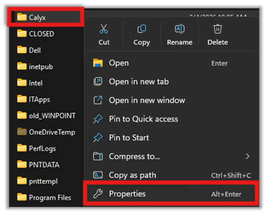 12. Right-click the folder you created (for example, Calyx), and then click Properties.