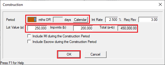7. Enter the Int Rate of the construction period and required reserves (if applicable) in the Req Rsv field.