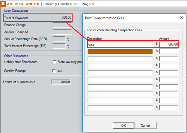 - Use the available fields to enter the Description and Amount of any construction handling and inspection fees paid by the borrower.