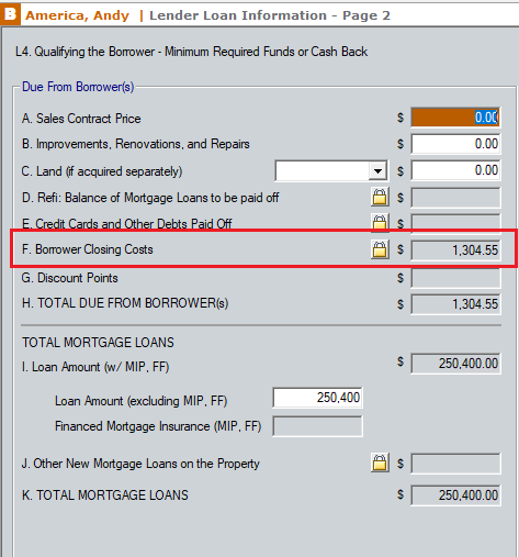 - Making the selection on the Fees Worksheet will calculate the Lender-Paid Compensation to reflect under the Due from Borrower(s) section for the Lender Loan Information - Page 2, line F. Borrower Closing Costs.