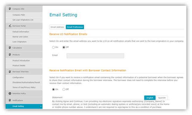 - Under the Notifications, verify “Receive notification email with borrower contact information” is enabled in Email Setting > Email Preference.