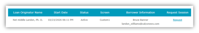 Borrower contact details — If the borrower agreed to share their information, their name and email address will appear within the table. If they did not agree, those fields remain blank, but the borrower can still take part in Screen Share.