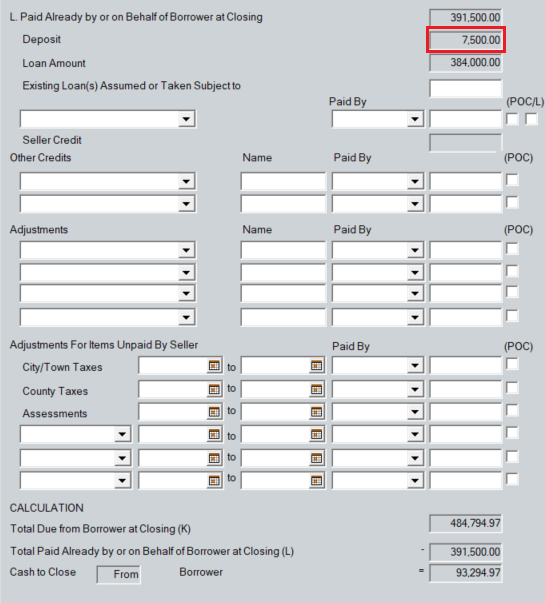 10. Navigate back to the Closing Disclosure Pg. 3 > Summaries of Transaction > L. Paid Already by or on Behalf of Borrower at Closing and verify the Amount entered has carried over into the Deposit field.