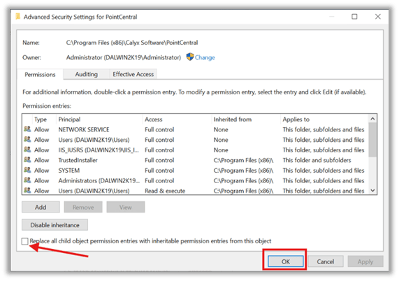 14. Select Replace all child object permission entries with inheritable permission entries from this object.