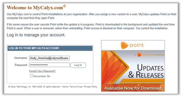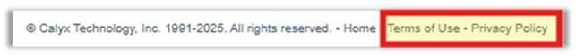 - Terms of Use – Opens Calyx’s legal terms for using the software and portal.