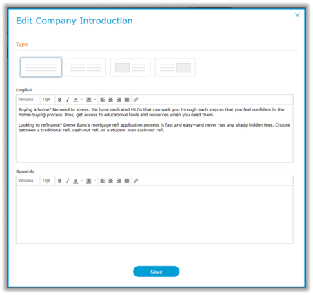 d. Click the Save button to close the Edit Company Introduction window.
