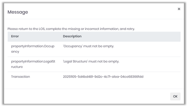 If any required data is missing or invalid (for example, incomplete borrower info or missing property details), Zenly will display an error message after you click Continue.