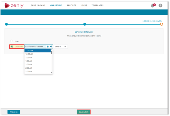 One-Time Marketing Campaigns in Zenly give you full control over when and to whom a message is sent. Designed for announcements, promotions, rate updates, or other time-sensitive communication, these campaigns allow you to target a specific borrower group and schedule delivery at an exact date and time—without ongoing automation logic.